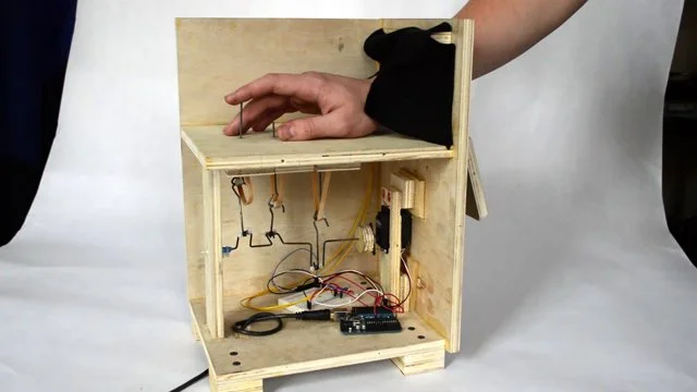 Wood, Servo, Steel, Rubber, Zip ties, Arduino UNO